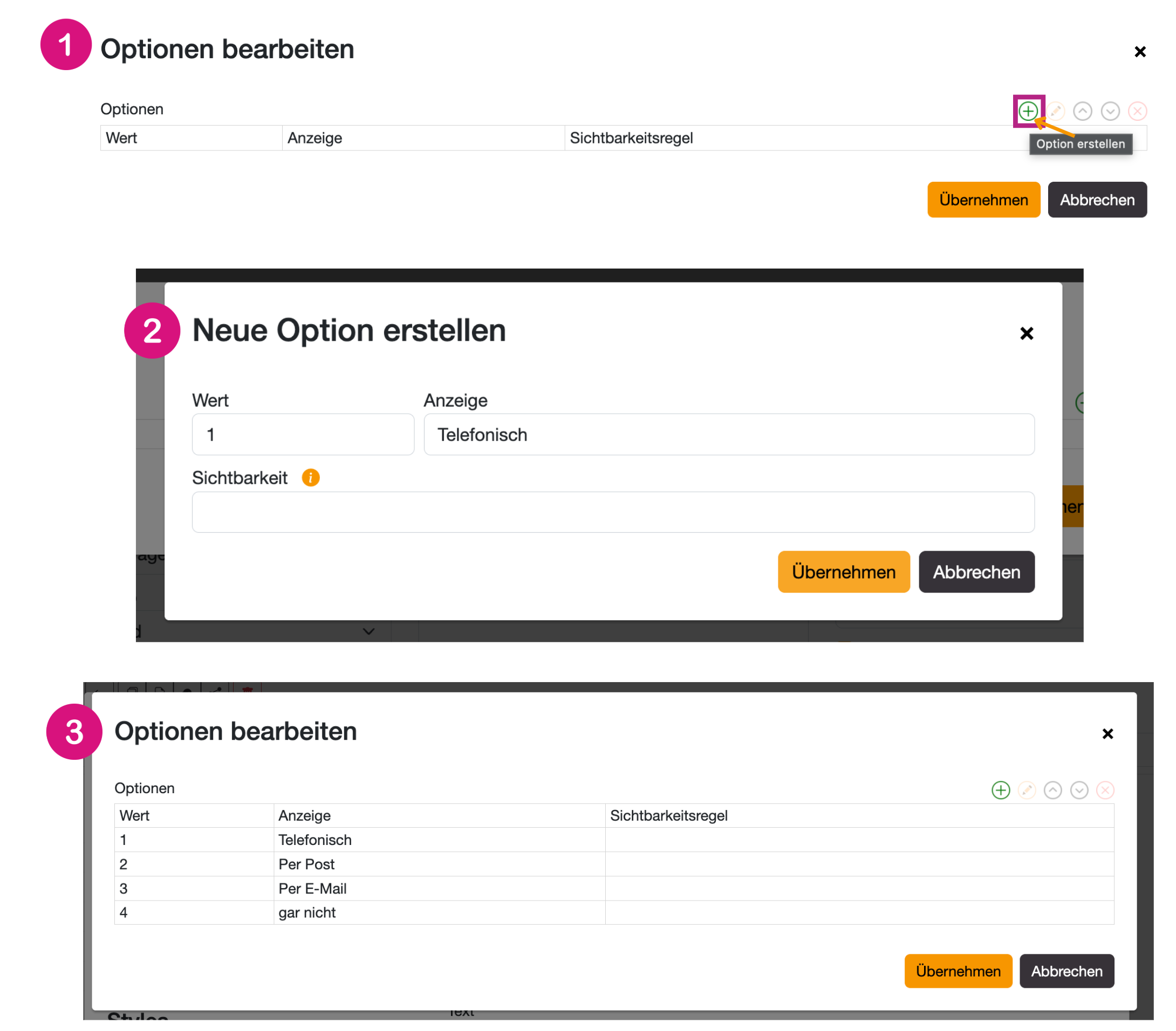 1. Unter Optionen bearbeiten durch Klick auf das grüne Plus „Option erstellen“.